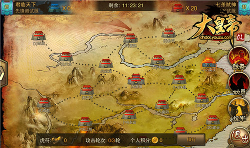 “无国战,不三国”,GVG模块一直是三国策略游戏中的重头戏,也是最能让三国迷感受乱世相争、群雄逐鹿、策略为王的玩法。《大皇帝OL》作为S级的三国策略游戏,于核心的GVG玩法自然也是备用心思,我们收集多方玩家建议,将原有联盟战重新炼造,推出全新的公会战——“群雄逐鹿”。两个实力相当的联盟在崭新的大地图上争夺20城池的归属,每个城池有2-5个守军,守军为敌方联盟的成员,需要一次性全部打败才能占领城池。除了常规攻守之后还有两个一场只能使用一次的逆天大招,“鼓舞”可以为所有联盟成员增加一枚虎符,“虎符”用来复活战死的英雄;“动员”则是增加一轮次攻击;另外“援军”可以放入和借出5星英雄,使用得当均可大大影响战局。