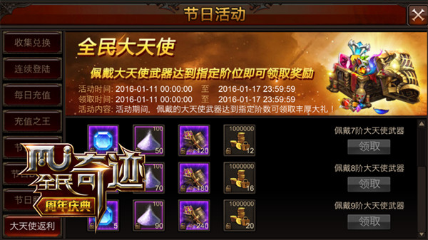 熟悉《全民奇迹MU》的小伙伴们都知道,但凡到了节日之前,奇迹大陆上的各种壕礼活动总是嗨的让人停不下来。随着2016猴年春节将至,一大波新年活动也逐渐拉开了序幕,装备强化20、节日BOSS争夺、翅膀圣物升级……然而,与多样性的活动一同而来的,自然是玩家们所需求资源的大大增加。但正所谓“原汤化原食”,只要各位每天按部就班的好好来奇迹大陆“上班”,节日活动中能够领取的金币与绑钻,不仅足以满足活动内容所需,甚至于在接下来的数月内,都足够我们尽情挥霍了!