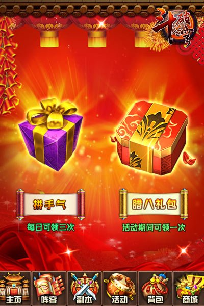 除此之外,游戏内专门设置了腊八活动主题界面,点击游戏主界面那碗热气腾腾的美味腊八粥,就可以进入极具中国风情的腊八活动页面。在这里除了可以获得一份腊八专属礼包。还有见证你人品和手气的拼手气礼物盒,每天三次机会体会抽取惊喜的好心情,大家不要错过。