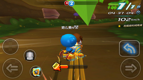 在画面当中玩家点击方向键即可控制赛车进行转向,而左方向键上方则是道具键,当玩家获取道具之后直接点击即可使用,而在右侧则是漂移键,不过在游戏当中只有在遇到转弯时,屏幕上会出现相应的操作提示之后,漂移键才可以被使用,而且只需要点击漂移键就可以自动漂移,而无需配合方向键,这样一来还是比较方便的。